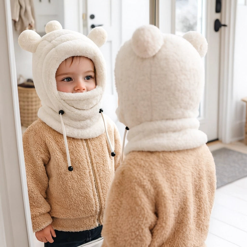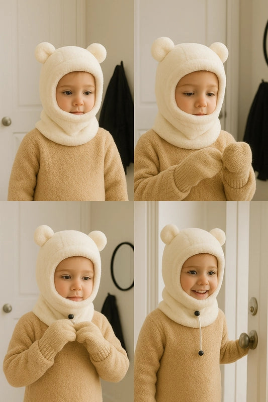 Grâce à notre cagoule Balaclava Petit Ours, plus besoin de batailler avec bonnet et écharpe : tout reste parfaitement en place jusqu'à l'école.